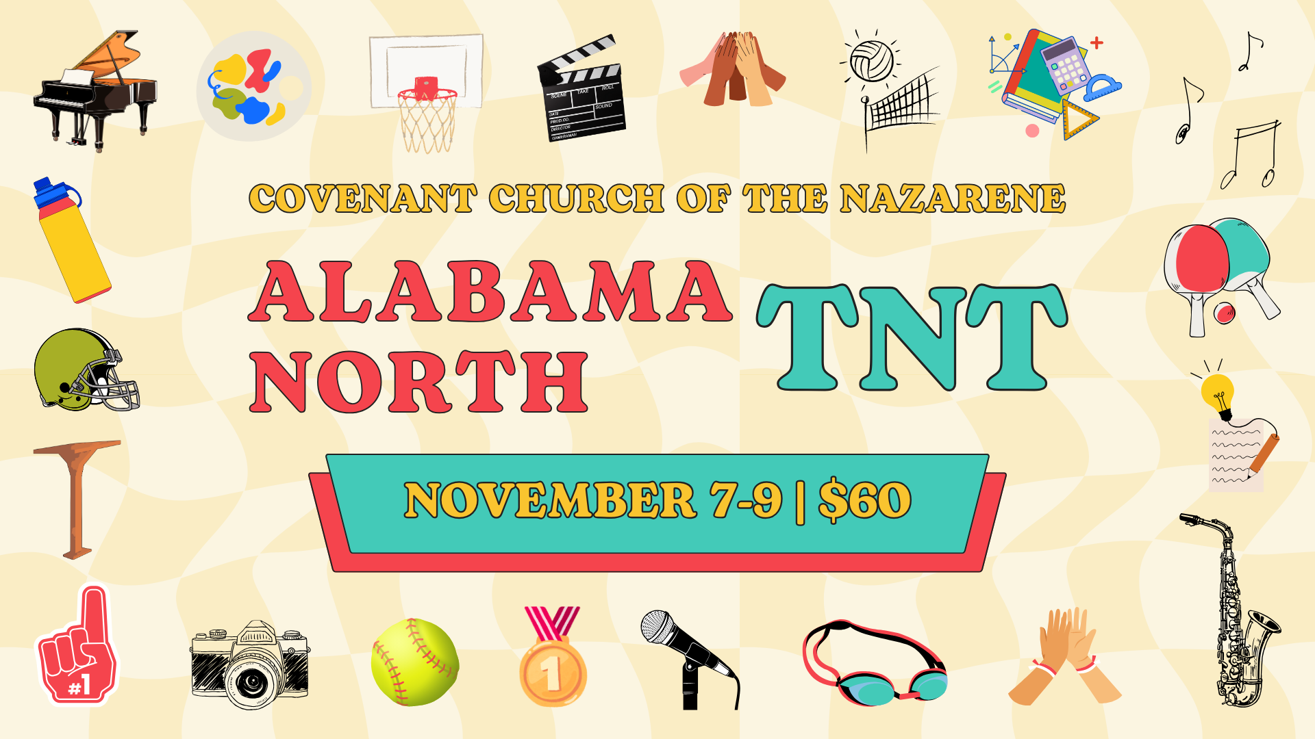 Mark your calendars! Alabama North District TNT is quickly approaching, and registration is NOW LIVE! The cost is $60 if registered by October 22 and $70 for the late fee registration if registered by October 29 (hotel cost not included). After October 29, registrations will not be accepted. We want to encourage every church to participate. If you have just one or two teenagers who attend your church, please make it a priority to send them. If you have no teens, please come out and see what our teens are up to. A link to hotel reservations will be available later this week.